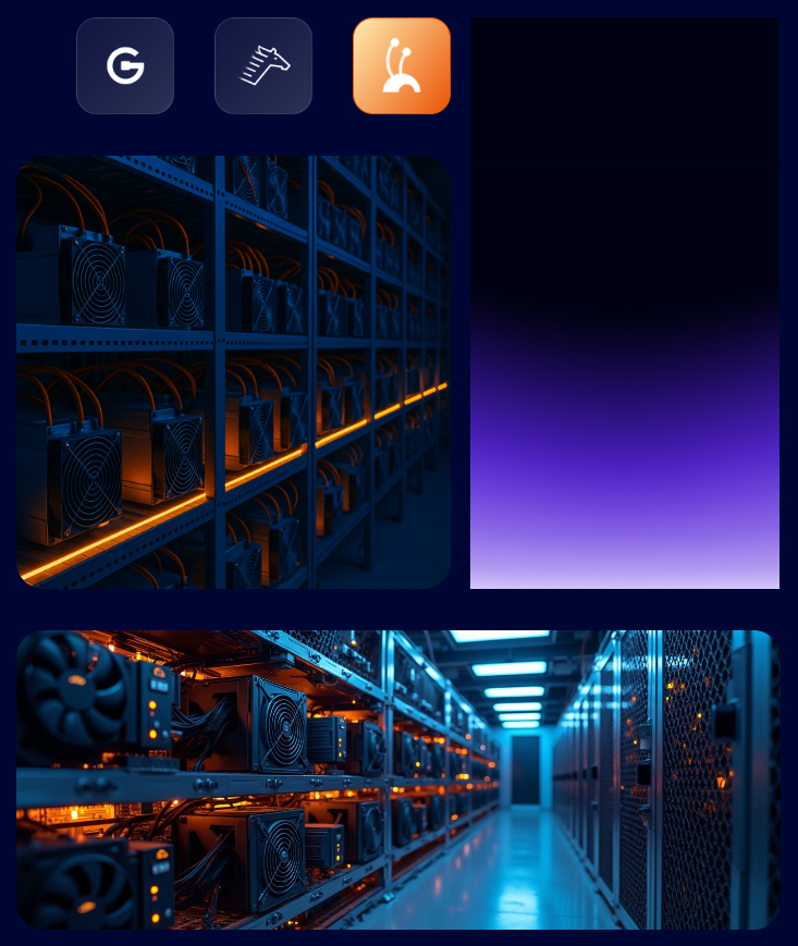 State-of-the-art mining farms equipped with high-speed internet, fire protection, and advanced cooling systems.